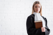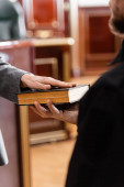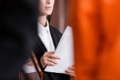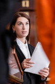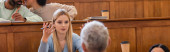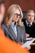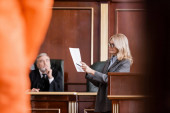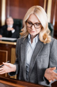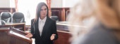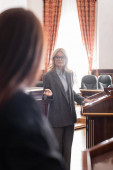 adwokat w średnim wieku wskazujący niewyraźnym świadkiem podczas przesłuchania w sądzie