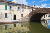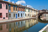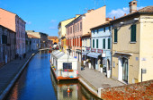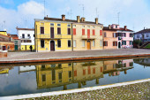 Małe włoskie miasteczko Comacchio znane również jako "Mała Wenecja", region Emilia Romagna, prowincja Ferrara, Włochy: Kolorowe domy w tradycyjnym stylu architektonicznym