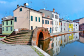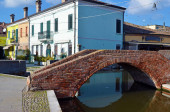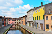 Zdjęcie "Małe włoskie miasteczko Comacchio znane również jako "Mała Wenecja", region Emilia Romagna, prowincja Ferrara, Włochy: Kolorowe domy w tradycyjnym stylu architektonicznym" może być wykorzystywane do celów osobistych i komercyjnych zgodnie z warunkami zakupionej licencji Royalty-free. Obraz jest dostępny do pobrania w jakości wysokiej rozdzielczości do 5760x3840.