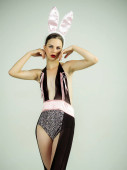 Piękna, seksowna, naga kobieta w Halloween. Kostium króliczka wielkanocnego i czarna maska koronki. Sexy kobieta z króliczymi uszami.