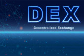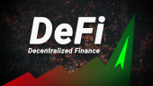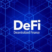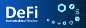 DeFi Decentralizowany baner finansowy dla zdecentralizowanego systemu finansowego na ciemnoniebieskim abstrakcyjnym futurystycznym tle. Złoty tekst DeFi.