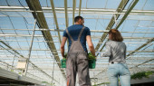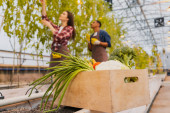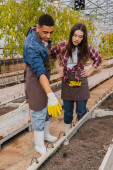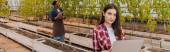Pozytywny afrykański rolnik w fartuchu wskazujący ręką w pobliżu kolegi w szklarni, sztandar