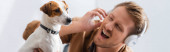 Uśmiechnięty nastolatek z zespołem Downa robi zdjęcia pudla w domu, sztandar