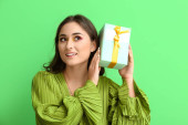 Atrakcyjna młoda kobieta z niezwykłym błyszczącym makijażem na tle koloru