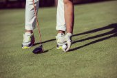 przycięty widok afrykańskiego seniora umieszczenie golfa tee na zielonym trawniku