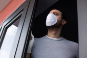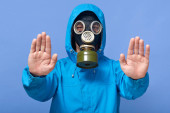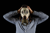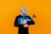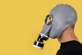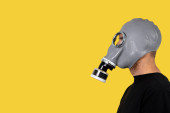 Człowiek z ręką do góry i maską gazową na żółtym tle