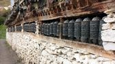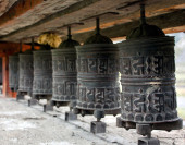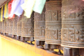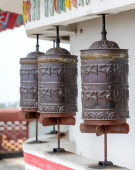Klasztor Pema Osel Ling. Kręcące się metalowe kółka modlitewne. Mantra jest napisana w języku tybetańskim, na zewnątrz koła.