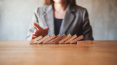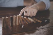 Zbliżenie obraz palca spróbuj zatrzymać spadające drewniane bloki domina dla koncepcji rozwiązania biznesowego