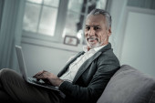 Szczęśliwy człowiek patrząc na laptopa siedzi w pokoju