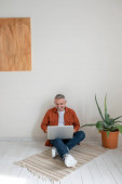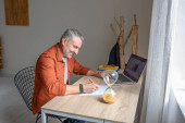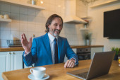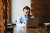 Mężczyzna wpisując patrząc na ekran laptopa siedzi przy stole