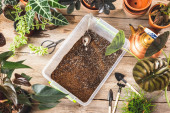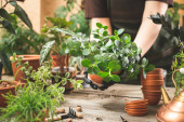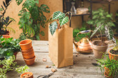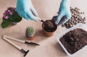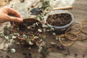Kobiece dłonie ogrodnika dodają chipsy z łupiny kokosowej do mieszanki glebowej. Przygotowanie gleby do sadzenia roślin