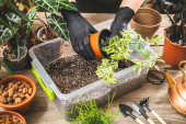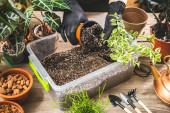 Zdjęcie "Kobiece dłonie ogrodnika dodają chipsy z łupiny kokosowej do mieszanki glebowej. Przygotowanie gleby do sadzenia roślin" może być wykorzystywane do celów osobistych i komercyjnych zgodnie z warunkami zakupionej licencji Royalty-free. Obraz jest dostępny do pobrania w jakości wysokiej rozdzielczości do 5760x3840.