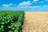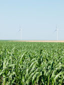 Niski kąt widzenia wśród młodych upraw soi, podszyte rzędy, duże turbiny wiatrowe stoją w tle pola rolniczego, obracając i wytwarzając czystą odnawialną energię elektryczną.