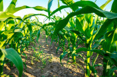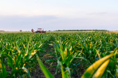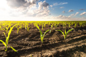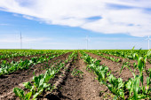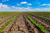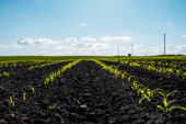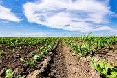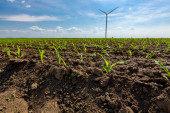Zdjęcie "Niski kąt widzenia wśród młodych upraw soi, podszyte rzędy, duże turbiny wiatrowe stoją w tle pola rolniczego, obracając i wytwarzając czystą odnawialną energię elektryczną." może być wykorzystywane do celów osobistych i komercyjnych zgodnie z warunkami zakupionej licencji Royalty-free. Obraz jest dostępny do pobrania w jakości wysokiej rozdzielczości do 5760x3840.