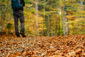 mężczyzna ubrany w żółte praktyki trekking przez kasztanowy las w autum