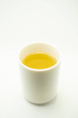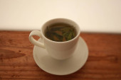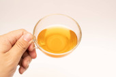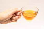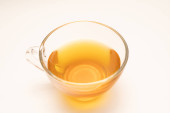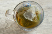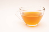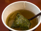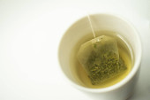 Zielona torebka herbaty w filiżance. Filiżanka aromatycznej zielonej herbaty na białym tle. Filiżanka z zielonej herbaty w izolacji.