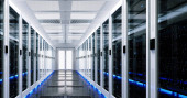 Strzał w centrum danych z wieloma rzędami w pełni operacyjnych stojaków serwerowych. Nowoczesna telekomunikacja, Sztuczna inteligencja, duży obszar serwera, renderowanie 3d