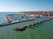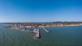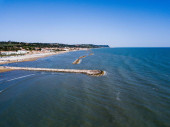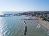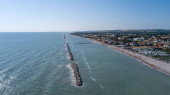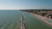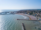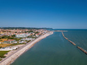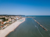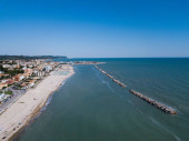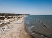 Włochy, lipiec 2022 r.: widok z lotu ptaka na miasto Fano z morzem, plażami i parasolami