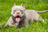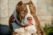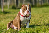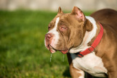 Zdjęcie "Czekoladowy brązowy kolor American Bully pies jest na zielonej trawie. Średniej wielkości pies z umięśnionym ciałem" może być wykorzystywane do celów osobistych i komercyjnych zgodnie z warunkami zakupionej licencji Royalty-free. Obraz jest dostępny do pobrania w jakości wysokiej rozdzielczości do 5760x3840.
