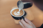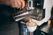 Barista pouring milk in glass of fresh made coffee making latte or cappuccino. High quality photo