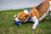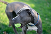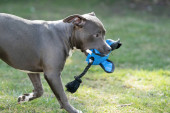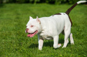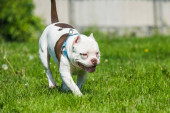 White American Bully puppy dog in move with a sock toy on grass.