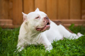 Zdjęcie "White American Bully puppy dog in move with a sock toy on grass." może być wykorzystywane do celów osobistych i komercyjnych zgodnie z warunkami zakupionej licencji Royalty-free. Obraz jest dostępny do pobrania w jakości wysokiej rozdzielczości do 5760x3840.