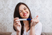 Szczęśliwa młoda kobieta, patrząc na test ciążowy czeka na nowe dobre