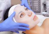 Kosmetolog do zabiegu oczyszczania i nawilżania skóry, nakładający maskę na twarz młodej kobiety w salonie kosmetycznym.Kosmetologia i profesjonalna pielęgnacja skóry.