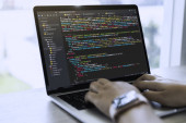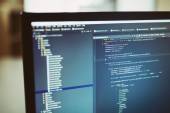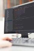 Deweloper działa na kodów źródłowych na komputerze w biurze.