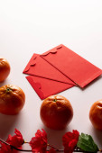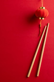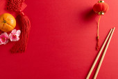 Kompozycja tradycyjnych chińskich fanów i dekoracje na czerwonym tle. Chiński Nowy Rok, tradycja i koncepcja świętowania.