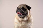 czystorasowy pies mopsa patrzący w kamerę i wystający język odizolowany na szaro