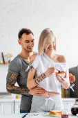 mężczyzna całowanie uwodzicielski żona w bielizna i koszula w pobliżu naleśniki w kuchnia
