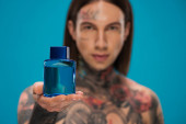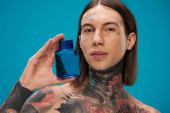 młody i wytatuowany mężczyzna patrzący na butelkę z perfumami wyizolowanymi na niebiesko