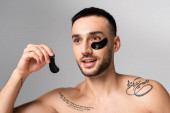 wytatuowany młody człowiek nakładający glinianą maskę pędzlem kosmetycznym i miską z produktem izolowanym na niebiesko, sztandar