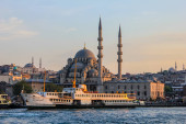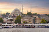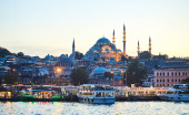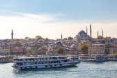 Stambuł, Turcja - 25 sierpnia 2022 r.: Widok na miasto Stambuł z mostu Galata w Eminonu z widokiem na Złoty Róg z promami, terminalami promowymi i meczetem Suleymaniye przed zachodem słońca