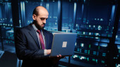 Zdjęcie "Niebezpieczny informatyk pracujący nad naruszeniem bezpieczeństwa, tworzący cyberatak na wielki serwer danych. Włamanie się do systemu komputerowego i oprogramowania, złamanie firewalla i kradzież informacji o firmie." może być wykorzystywane do celów osobistych i komercyjnych zgodnie z warunkami zakupionej licencji Royalty-free. Obraz jest dostępny do pobrania w jakości wysokiej rozdzielczości do 5760x3840.