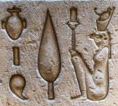 Egipskie hieroglify na ścianie świątyni Horusa w Egipcie
