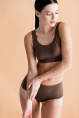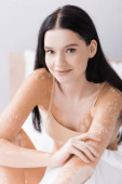 pozytywna młoda kobieta z biegunką i aparatem na zębach uśmiechnięta na szaro