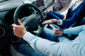 Na drodze do sukcesu. Pewny siebie i młody biznesmen w stylowym garniturze prowadzi swój nowy luksusowy samochód i uśmiecha się. Przedsiębiorca podróżujący do pracy służbowej podróżuje na odległość społeczną