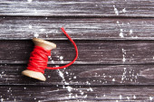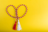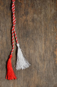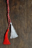 martenitsa. Bułgarskie symbole wiosny. Czerwono-białe frędzle nici na ziemi pokryte śniegiem. Dzień Baby Marty. Tapeta wiosennych kwiatów.
