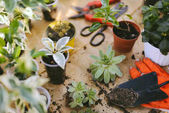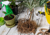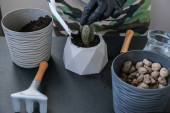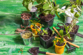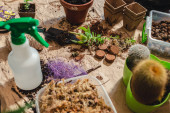 Plastikowy pojemnik ze składnikami mieszającymi glebę, mchem, perlitem, ziemią ogrodniczą i chipsami z łupiny kokosowej.
