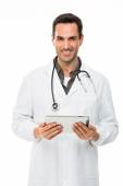 Pełnej długości portraif mężczyzna lekarza, uśmiecha się do kamery z skrzyżowanymi rękami i stetoskop
