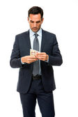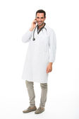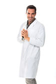 Połowę długości portret profil lekarza Mężczyzna zadumany, patrząc na kamery, jego ręce skłonność do ściany