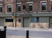 red brick building with green potted plants near shop with showcases on street with road signs in New York City