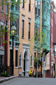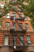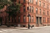 Lantern and tree near brick building on urban street in New York City
