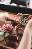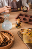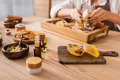 dried herbs and orange slices near essential oils and cropped african american craftswoman on blurred background