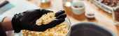 cropped view of african american woman holding wooden bowl and spoon with dried herbs in craft workshop, banner