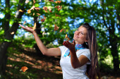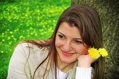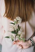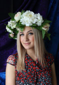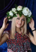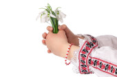 Bulgarian girl in traditional folklore costumes with snowdrop flowers and handcraft wool bracelet martenitsa symbol of Baba Marta, spring and Easter holiday,martisor