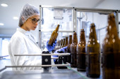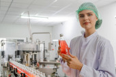 Portrait of beautiful caucasian factory worker in white coat standing by production line machine in water bottling plant.