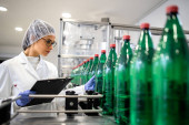 Food factory supervisor or worker holding digital tablet and thinking about production results inside refined vegetable oil production plant.
